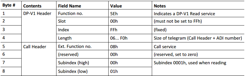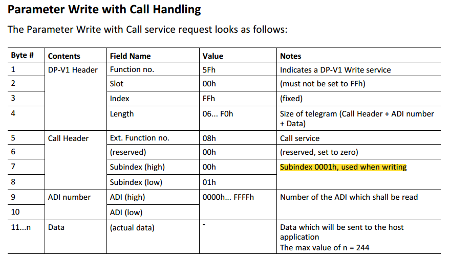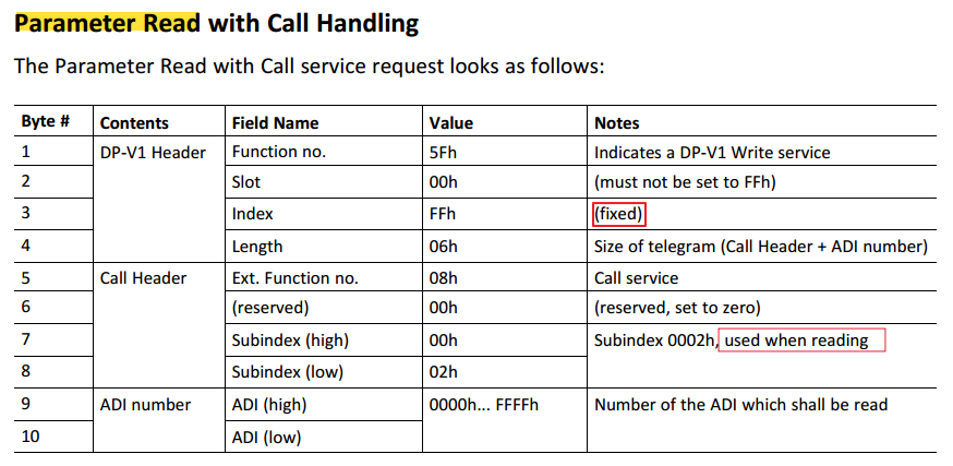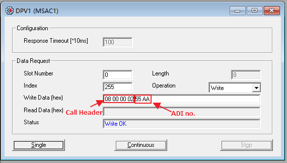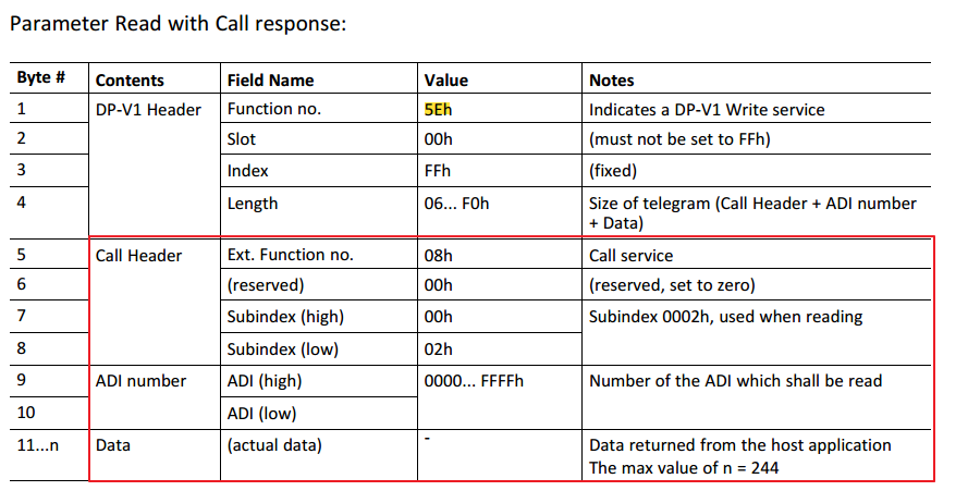 - 读取ADI之前首先需要使用DP-V1写命令(0x5F)将要读取的ADI号写入Slot 0x00/ Index 0xFF,Byte 5之后的字节为写命令的数据负载。
