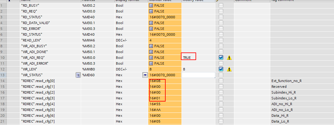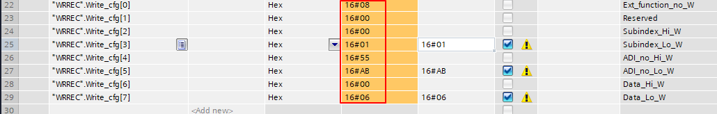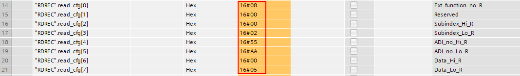 - 上文中已经展示了如何在TIA Portal中配置读取ADI,向ADI写入数据需更改Write_cfg数组的值,修改如下。